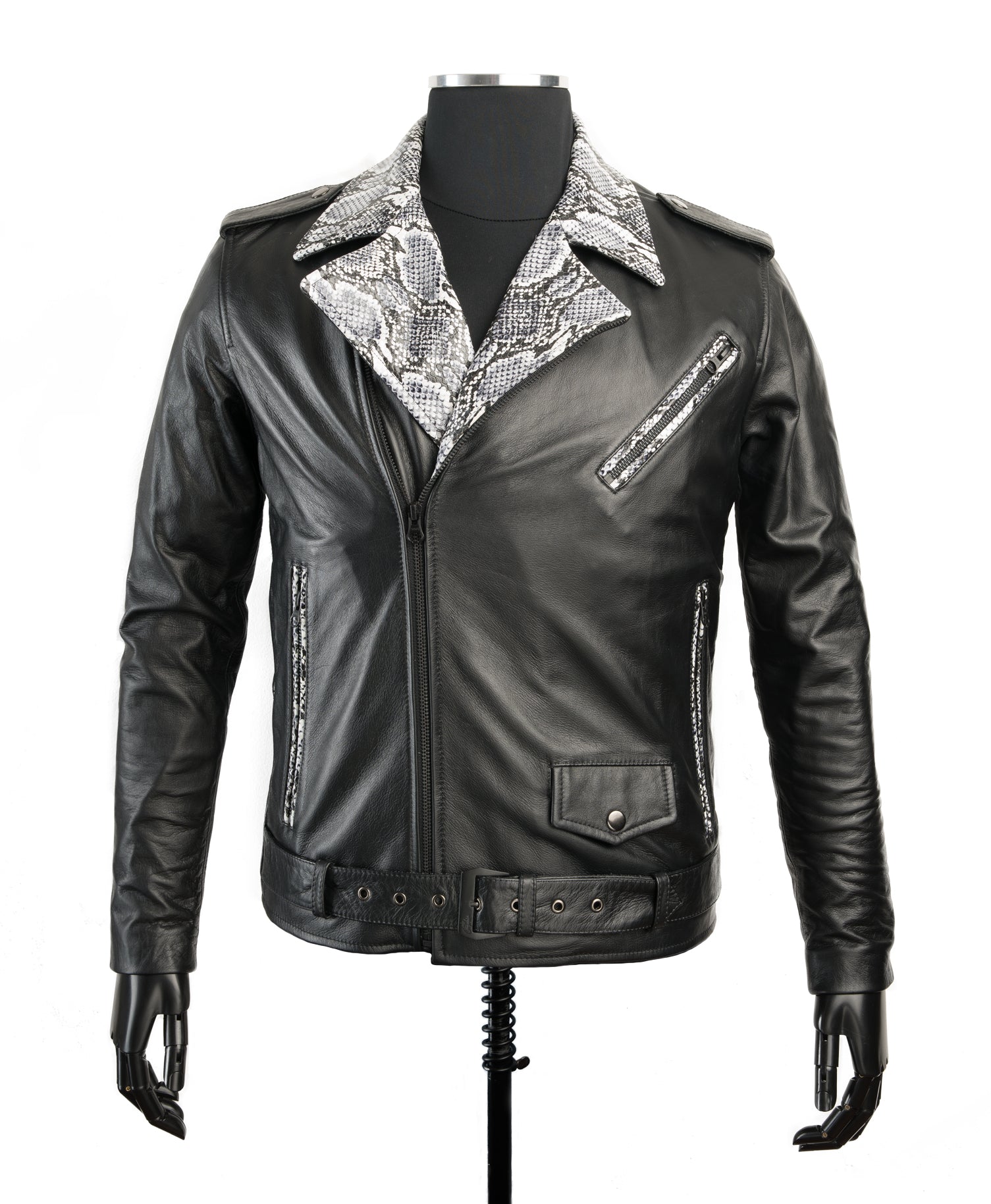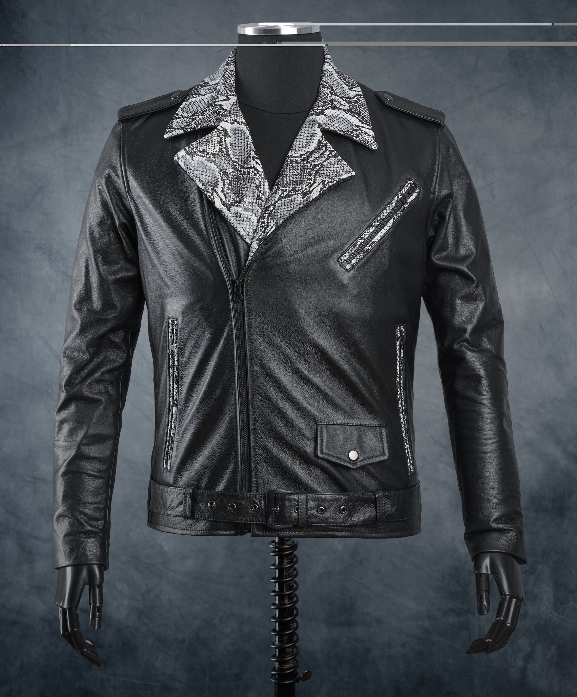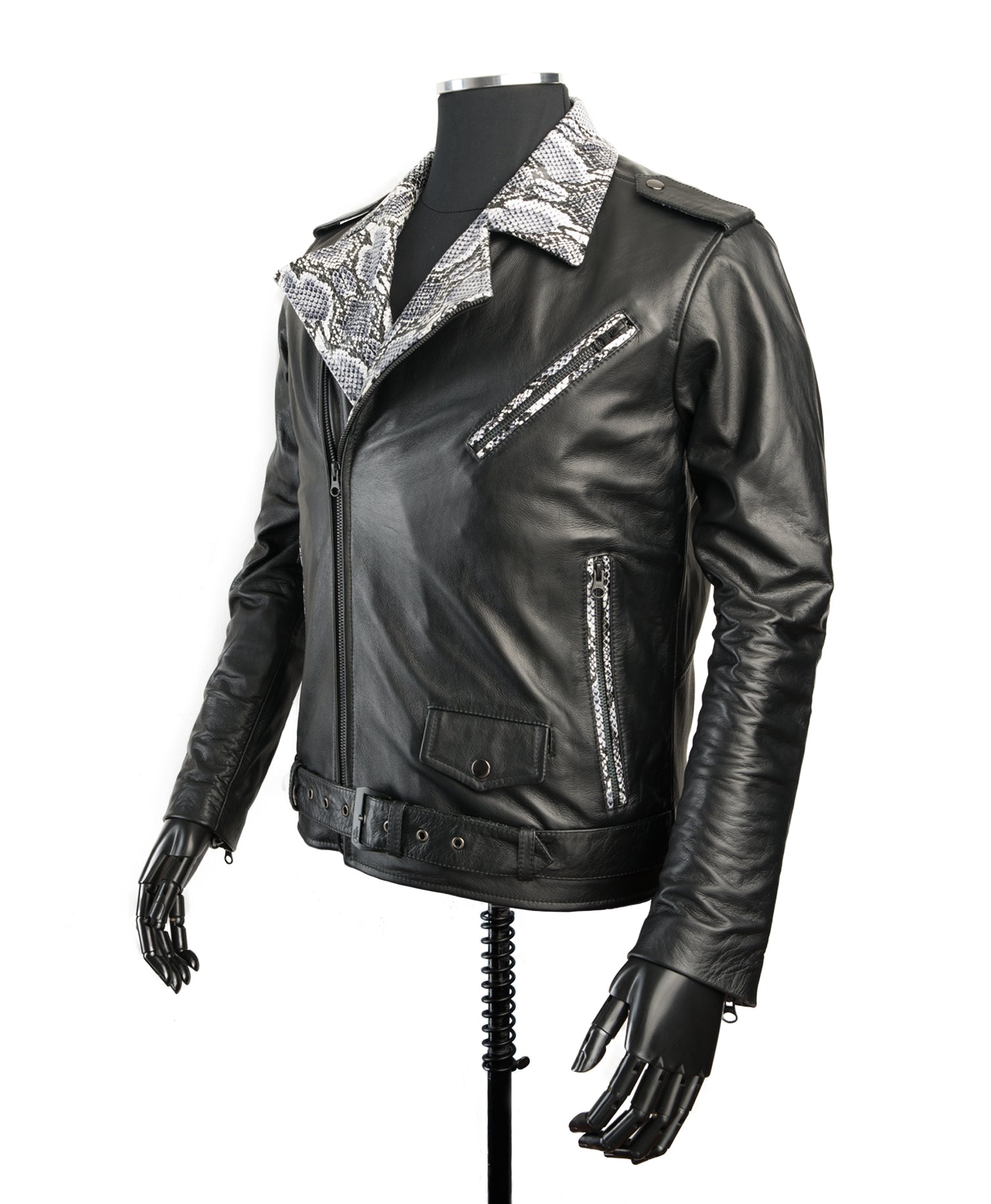 Chaqueta de hombre color Negro, 100% cuero, cremallera en pecho y bolsillos laterales, cremalleras en mangas, bolsillo monedero, correa decorativa ajustable en pretina, broches en cuello y solapas, forro interno en poliéster. Durabilidad a largo plazo, disponible en talla XS, S, M, L, XL, XXL, horma Slim Fit.