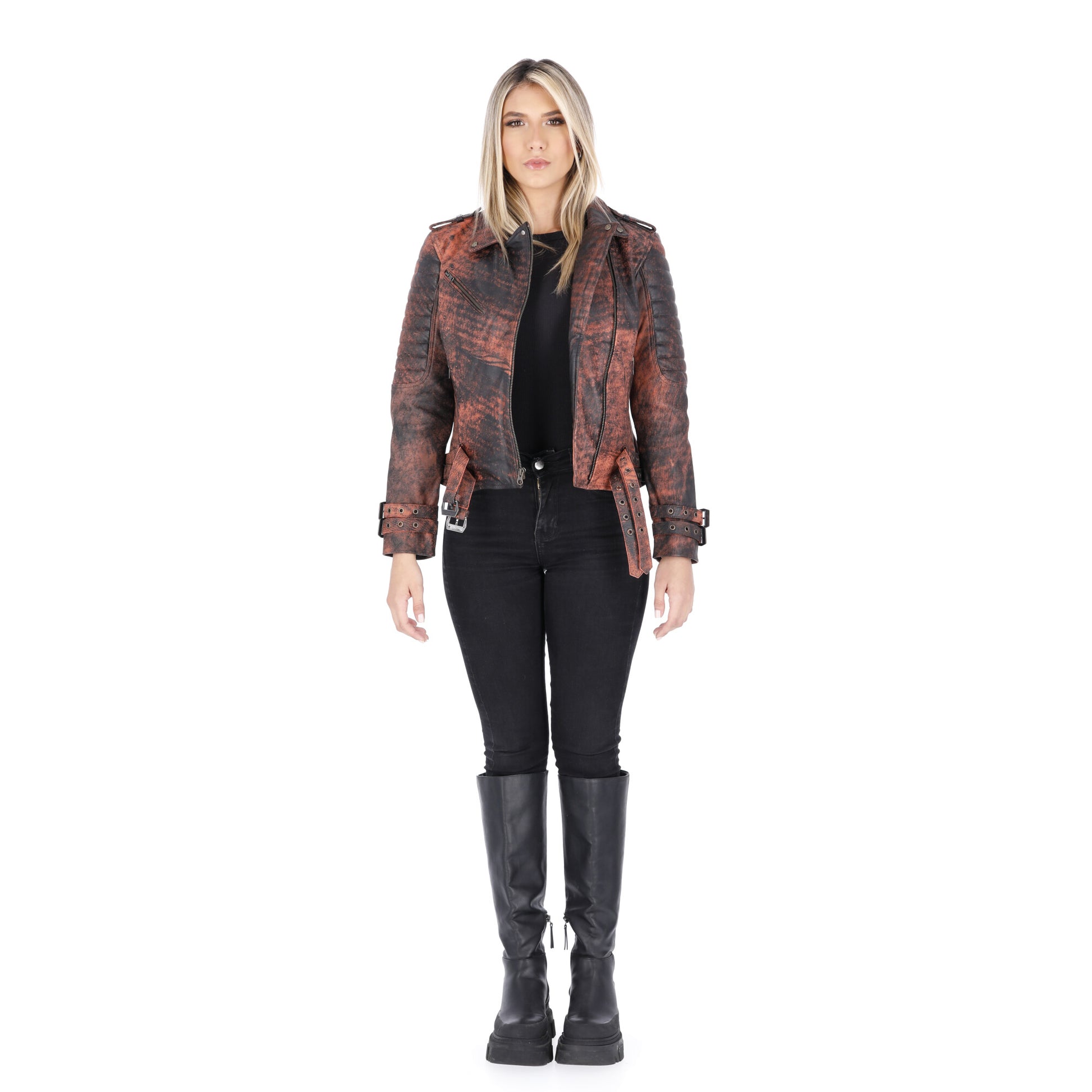 Chaqueta de mujer color Envejecido Base Terracota, 100% cuero. Bolsillo de pecho con cremallera, bolsillos laterales con cremalleras, correa en mangas ajustables, cremalleras decorativas en pretina ajustables, abullonados en mangas y espalda, broches en cuello, forro interno en poliéster, durabilidad a largo plazo, silueta slim fit.
