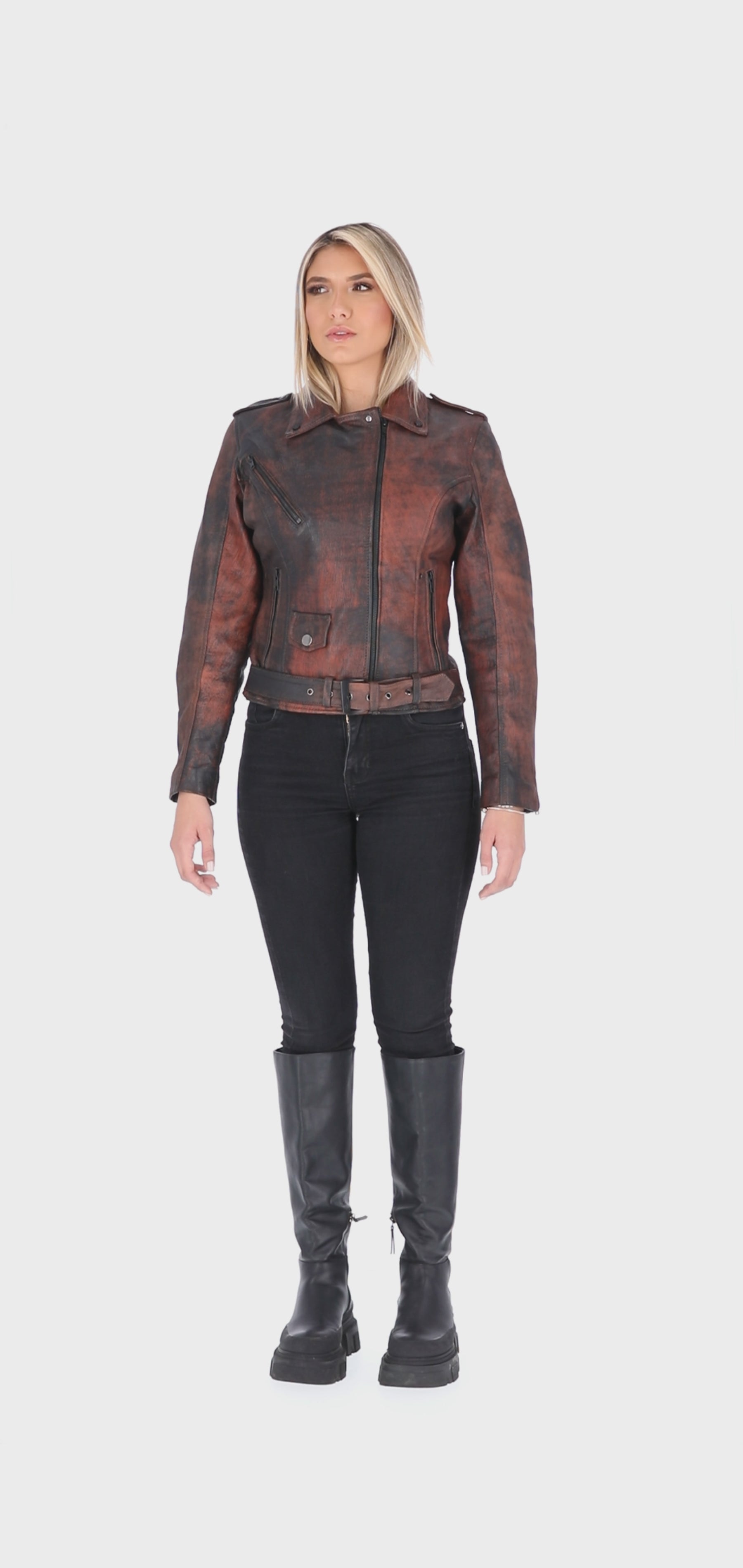 Chaqueta de mujer color Envejecido Base Terracota, 100% cuero. Broches en charretera, cuello y solapa, bolsillo de pecho con cremallera, bolsillo monedero, correa decorativa en pretina, cremalleras en mangas, forro interno en poliéster, durabilidad a largo plazo, disponible en talla XS, S, M, L, XL, XXL, silueta Slim fit.