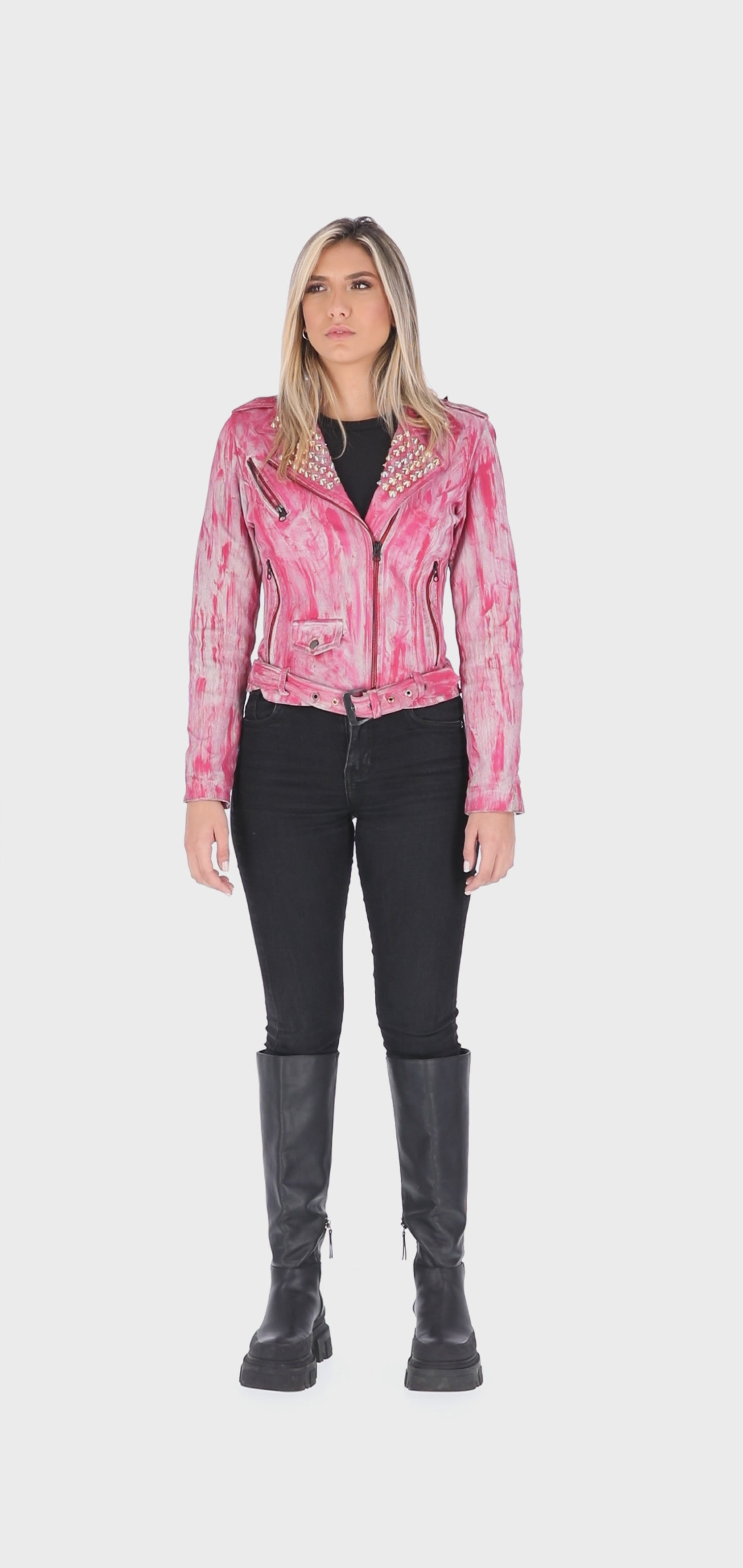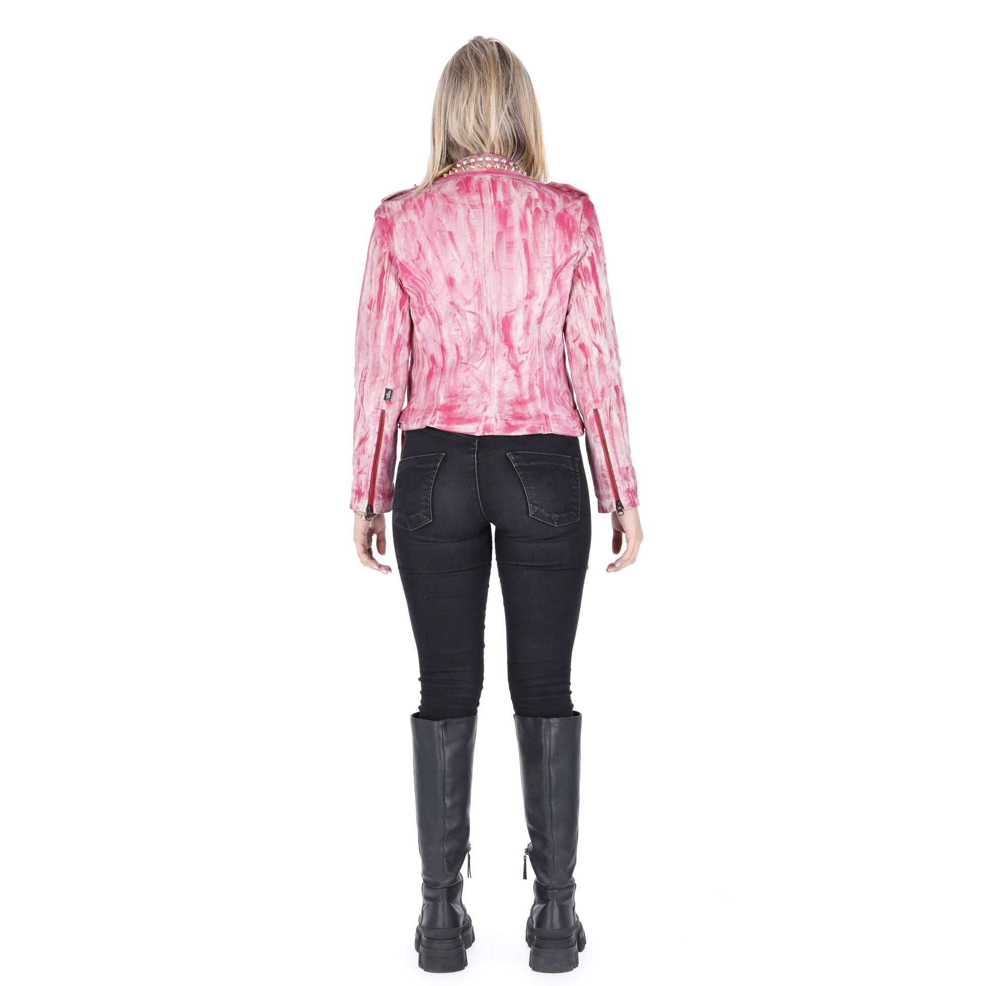 Chaqueta de mujer color Envejecido Rosa, 100% cuero. Broches en charretera, cuello y solapa, bolsillo de pecho con cremallera, bolsillo monedero, correa decorativa en pretina, cremalleras en mangas, forro interno en poliéster, durabilidad a largo plazo, disponible en talla XS, S, M, L, XL, XXL, silueta Slim fit.