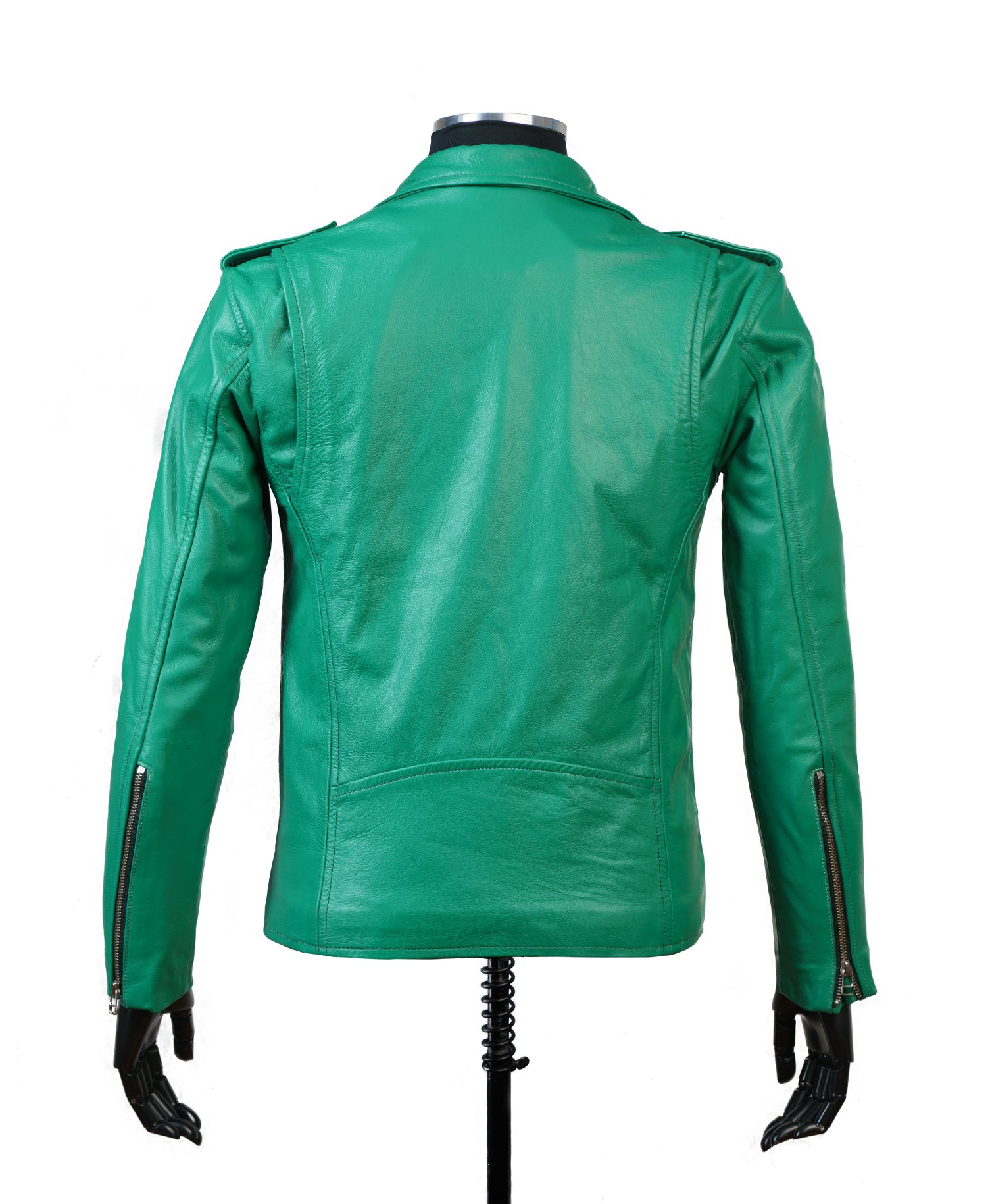 Chaqueta de hombre color Verde, 100% cuero, cremallera en pecho y bolsillos laterales, cremalleras en mangas, bolsillo monedero, correa decorativa ajustable en pretina, broches en cuello y solapas, forro interno en poliéster. Durabilidad a largo plazo, disponible en talla XS, S, M, L, XL, XXL, horma Slim Fit.