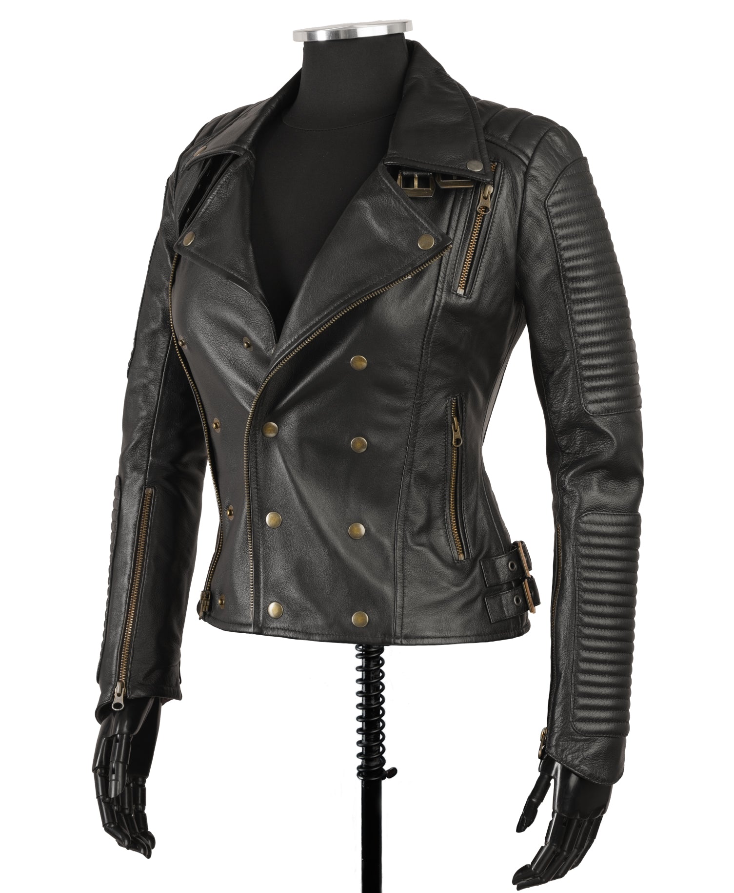 Chaqueta de Mujer, Color Negro, 100% cuero, Cremalleras cepillo en pecho y bolsillos laterales, cremalleras en mangas, correa decorativa ajustable en pretina y cuello, broches en cuello y solapas, abullonados en hombro y manga, forro interno en poliéster. Durabilidad a largo plazo, disponible en talla XS, S, M, L, XL, XXL, horma Slim Fit.