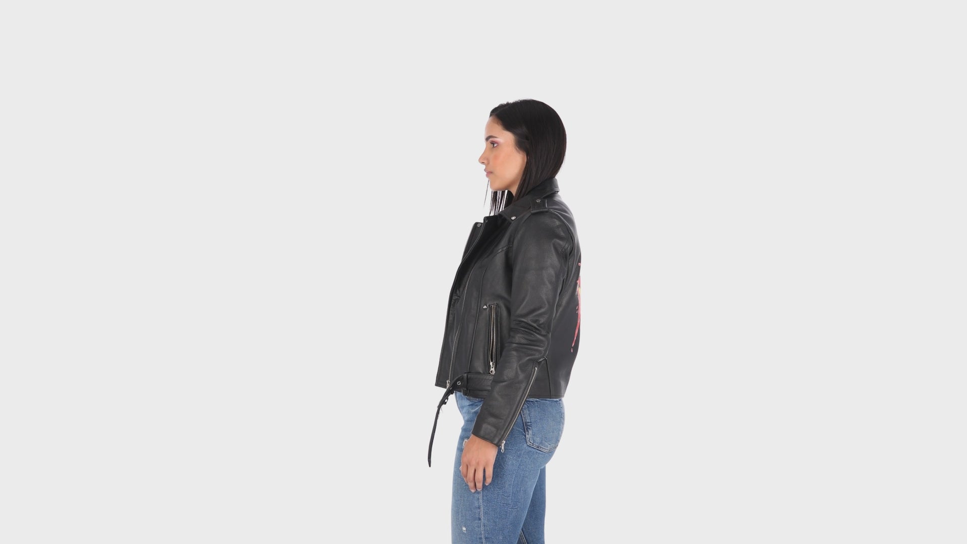 Chaqueta de mujer color Negro, 100% cuero. Estampado en espalda, broches en charretera, cuello y solapa, bolsillo de pecho con cremallera, bolsillo monedero, correa decorativa en pretina, cremalleras en mangas, forro interno en poliéster, durabilidad a largo plazo, disponible en talla XS, S, M, L, XL, XXL, silueta slim fit.