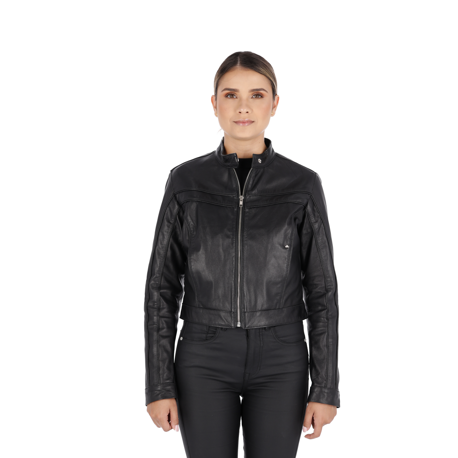 Chaqueta de mujer color Negro, 100% cuero. Cortes decorativos en pecho, bolsillos laterales, cremalleras en mangas, broches en cuello, forro interno en poliéster, durabilidad a largo plazo, disponible en talla XS, S, M, L, XL, XXL, silueta slim fit.