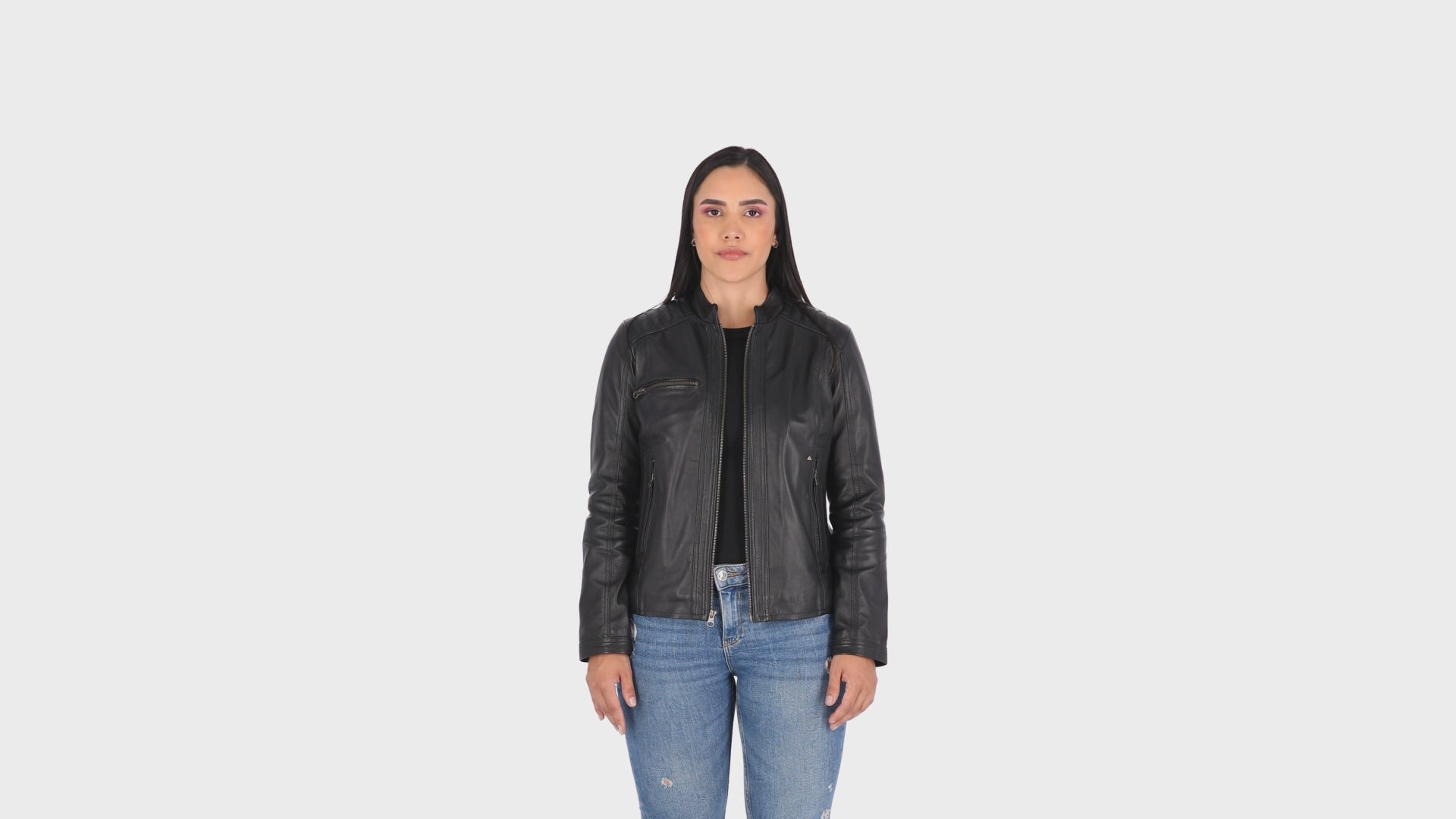Chaqueta de mujer color Negro. 100% cuero. Hombros abullonados, cuello alto, bolsillo de pecho, forro interno de poliéster, durabilidad a largo plazo, disponible en talla XS, S, M, L, XL, XXL, silueta slim fit.