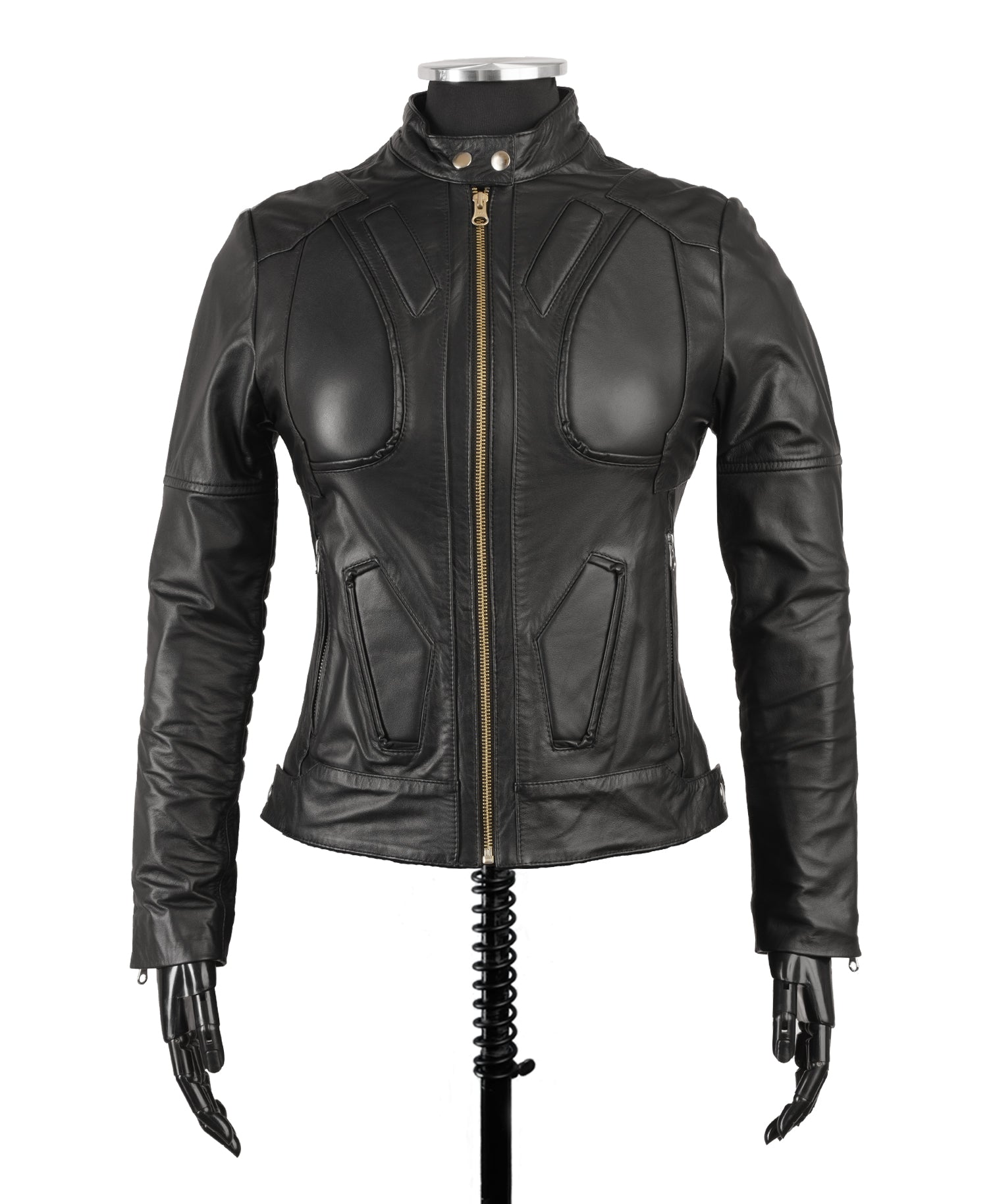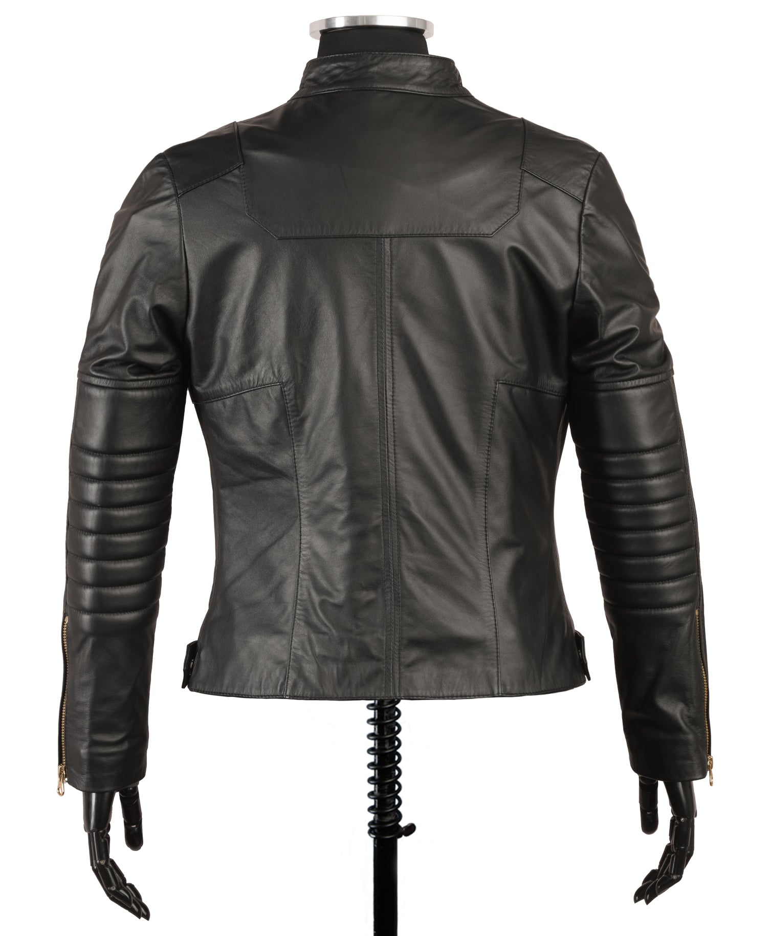 Chaqueta para mujer color Negro. 100% cuero. Cuello con broche, cremalleras en mangas, cremallera central, broches en pretina, cortes decorativos en toda la chaqueta, abullonados y cremalleras en mangas, forro interno en poliéster, silueta ajustada slim fit, disponible en talla XS, S, M, L Y XL.